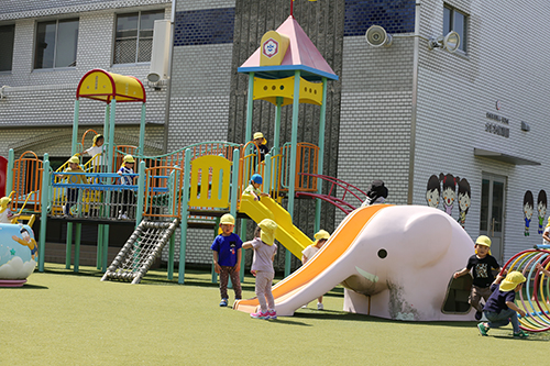 園庭には青々とした人工芝を敷きつめ、子どもたちが毎日安心して遊べる環境を整えています。